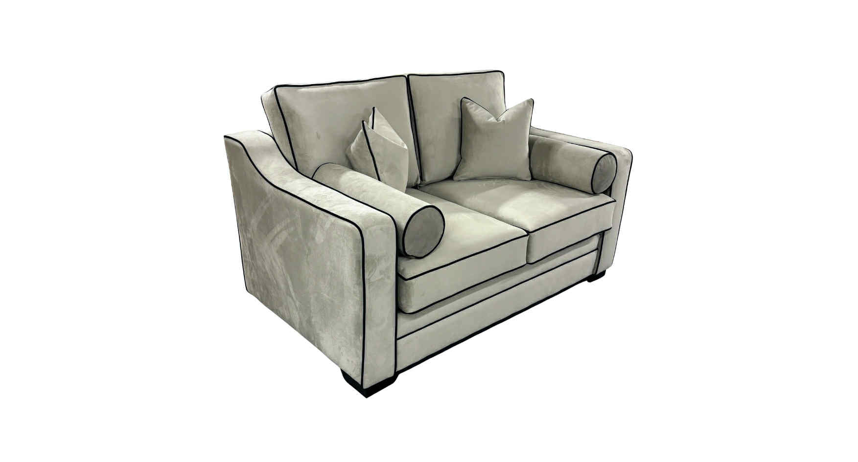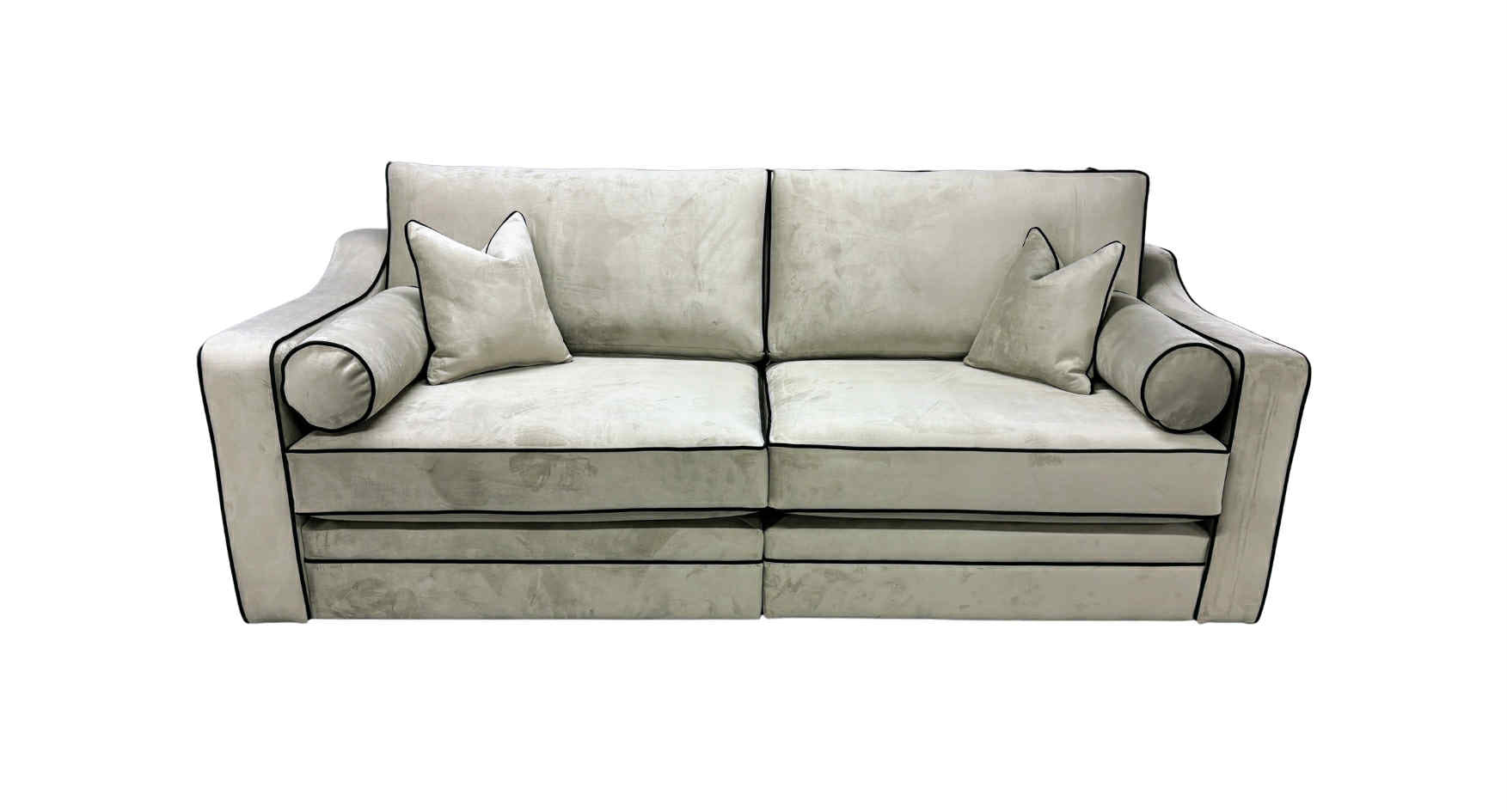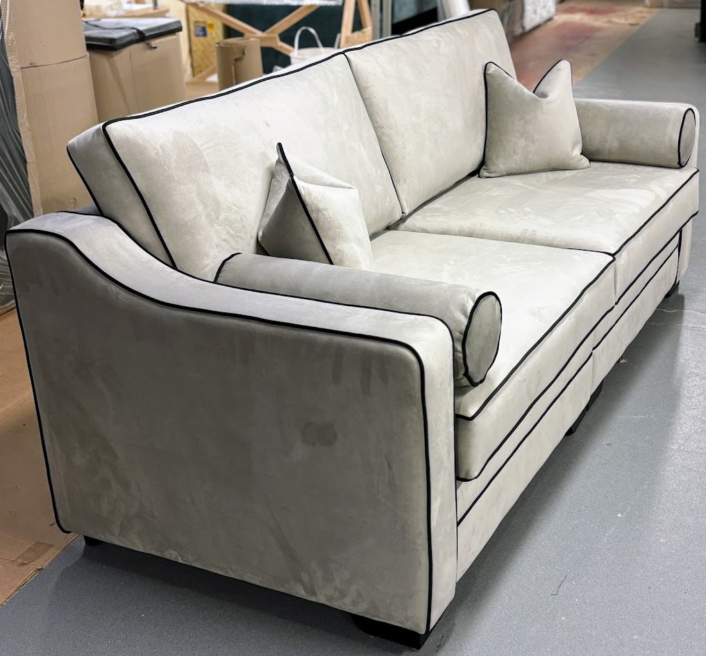 Designed with a sleek, structured silhouette and gently curved arms, this sofa brings together elegance and comfort in perfect harmony. The contrast piping enhances the tailored shape, while the bolster and scatter cushions soften the look and add extra comfort.