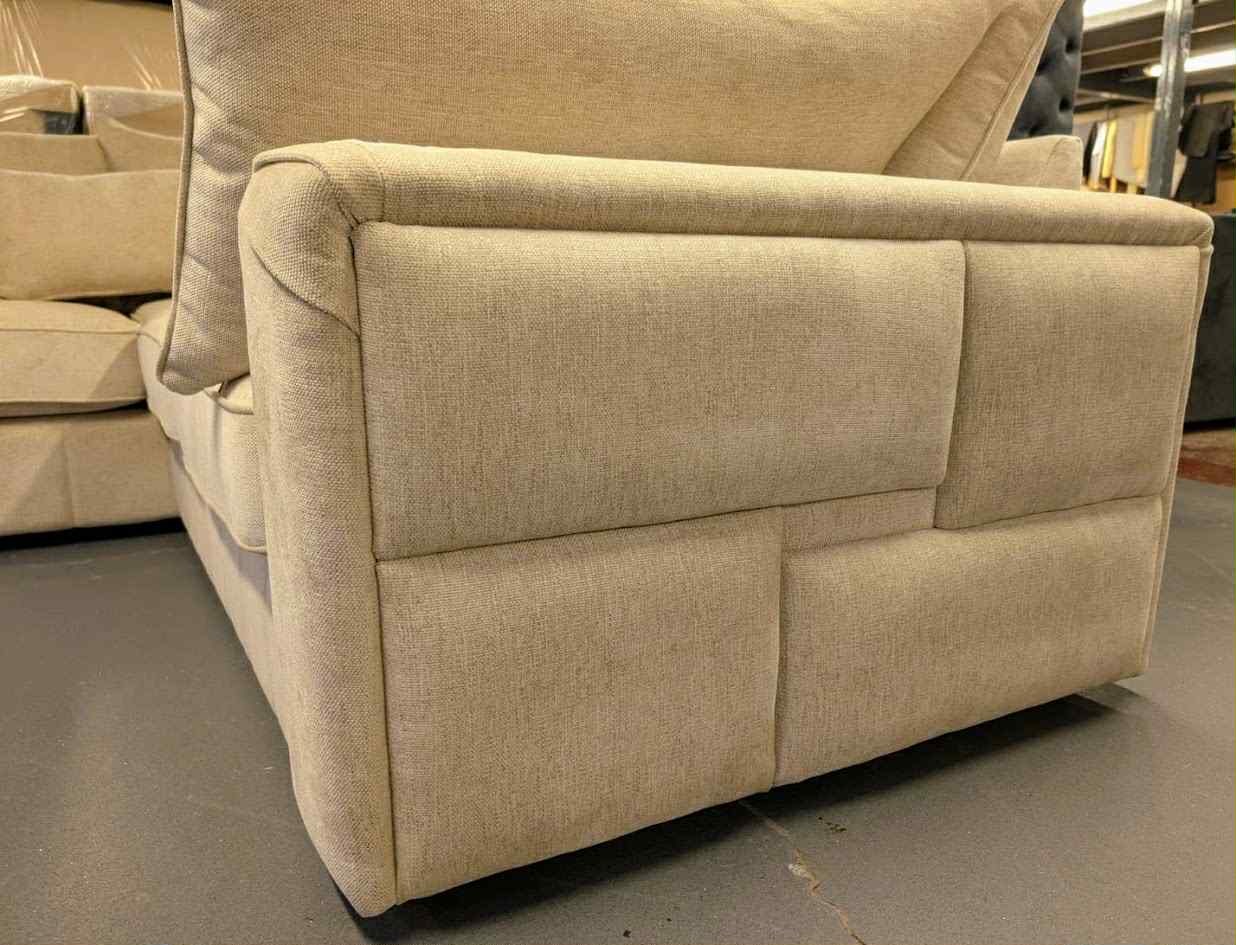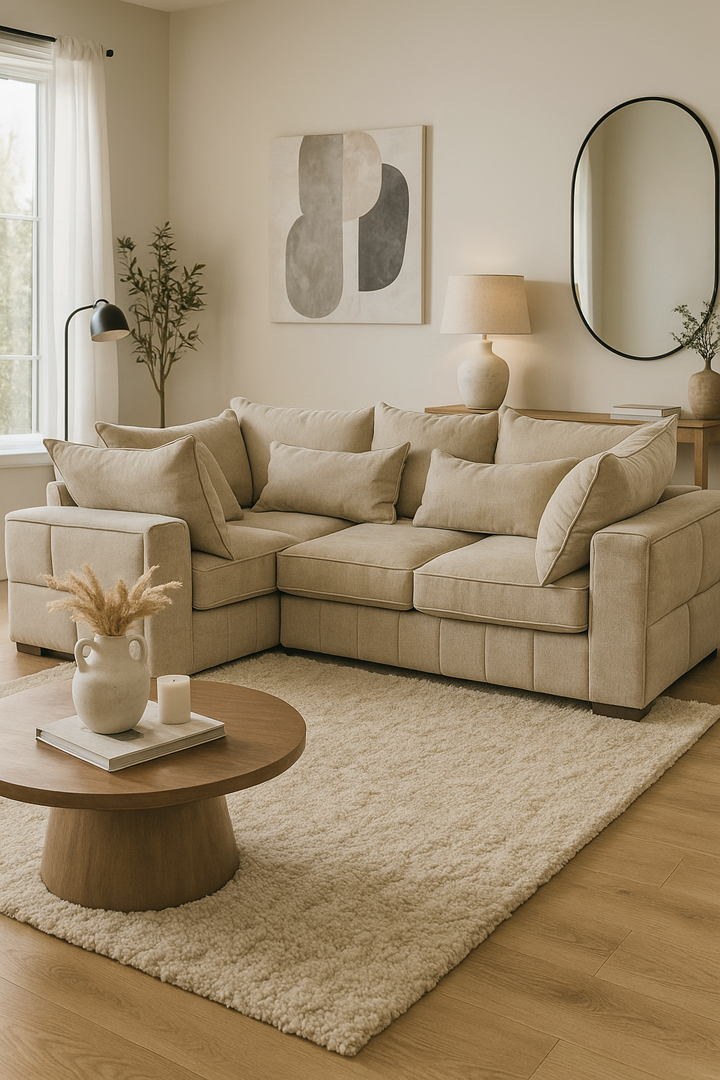 Upholstered in a soft neutral fabric, it offers both versatility and timeless appeal, making it easy to style with your existing décor. The deep seats and plush cushions invite you to sink in and unwind, while the structured frame adds a touch of elegance.